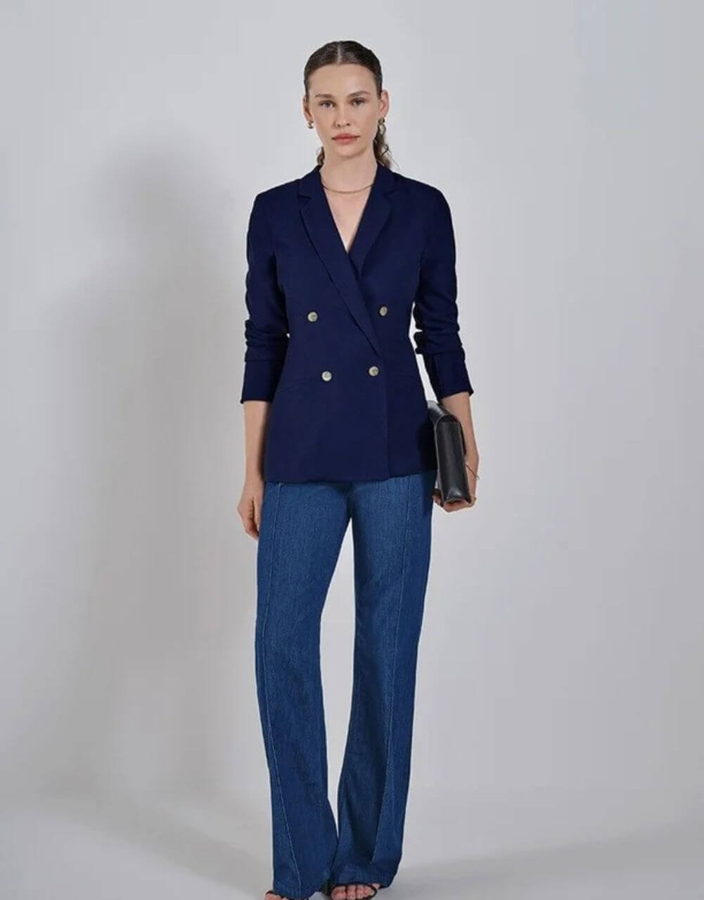 Confeccionado em tecido creponado de alfaiataria, o blazer traz elegância com modelagem alongada e levemente acinturada. Possui recortes princesa que valorizam a silhueta e bolso frontal embutido. Os botões com brasão nos punhos e na frente adicionam sofisticação