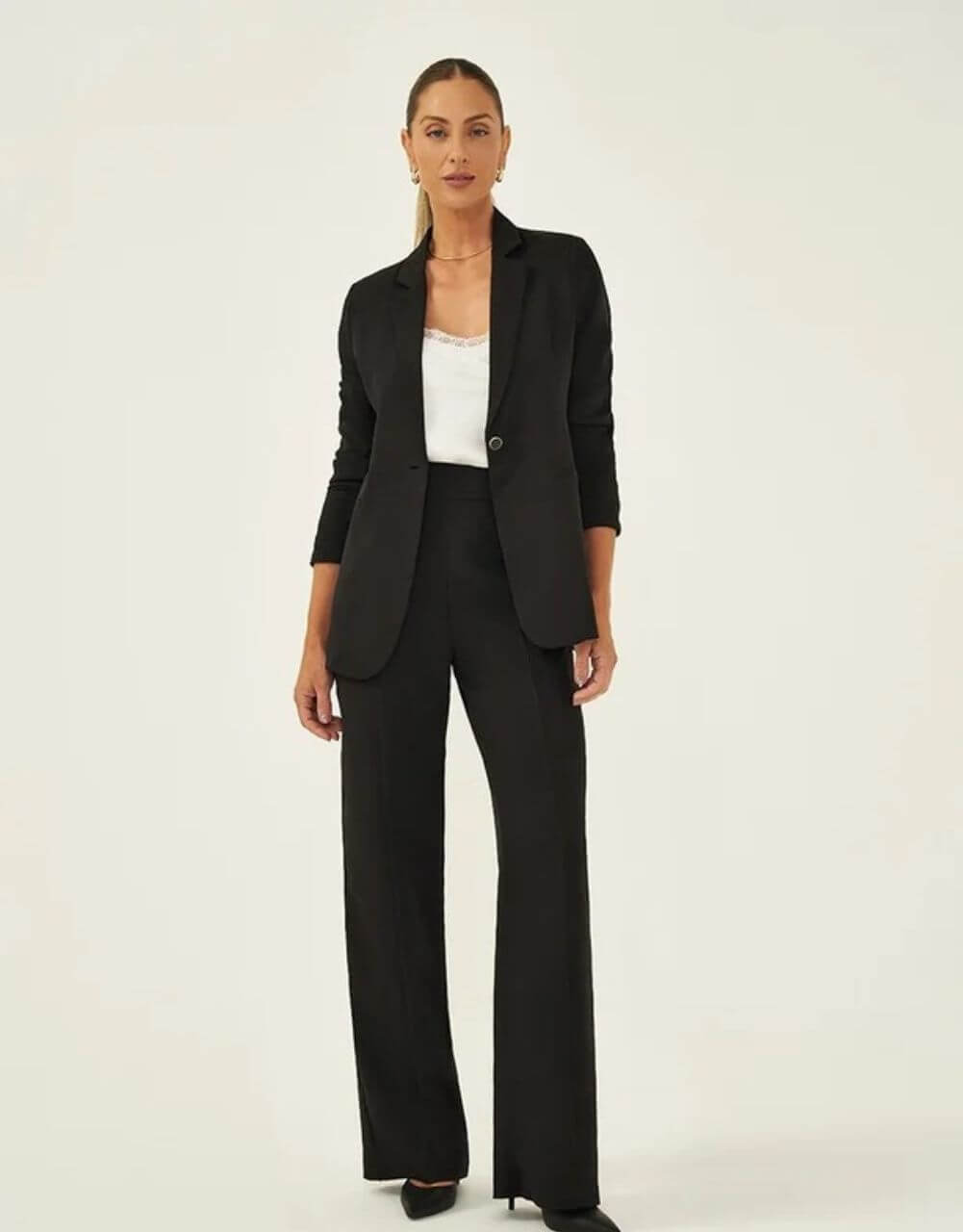 Com modelagem alongada e uma alfaiataria primuim, o blazer preto une conforto e sofisticação. Possui pence frontal, bolso embutido e botão de pé dourado com resina preta, também presente nas mangas. A modelagem valoriza diferentes biotipos.