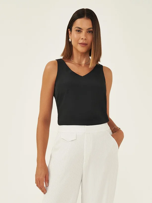 A Regata possui modelagem mais solta ao corpo, é confeccionada em tecido plano de crepe leve, um tecido fluido e sofisticado. Os seus detalhes contam com alças de 4cm de largura, decote V frente e costas e detalhe no próprio tecido embutido nas alças costas permitindo sustentação. Além disso, a regata possui pences no busto para evitar sobras de tecido, meio forro frente e costas e barra levemente arredondada. O decote costas conta com medalha monograma personalizada, detalhes que entregam toda a sofisticação da marca.