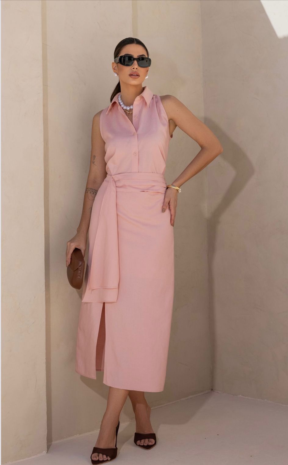 A modelagem evasê realça a silhueta, enquanto o comprimento midi e a fenda frontal trazem modernidade. A gola polo e o abotoamento frontal funcional com botões personalizados agregam um toque clássico.